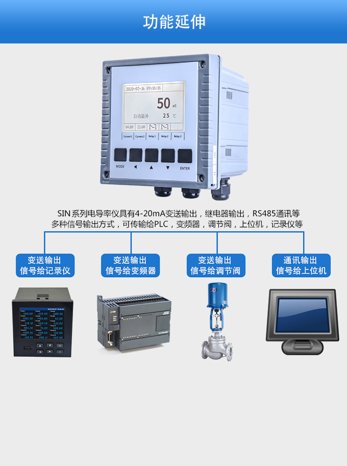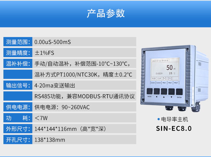 SIN-EC8.0工業電導率儀表,大屏顯示,可對各種工業用水的電導率(TDS)值進行連續測量和控制,本裝置廣泛應用于科學實驗裝備、化工、制藥、環保、冶金、造紙、食品、飲料及供水等行業。根據水工業的環境和特點結合國際供電標準,考慮了特殊環境的電氣設計規范,增加了220VAC供電。