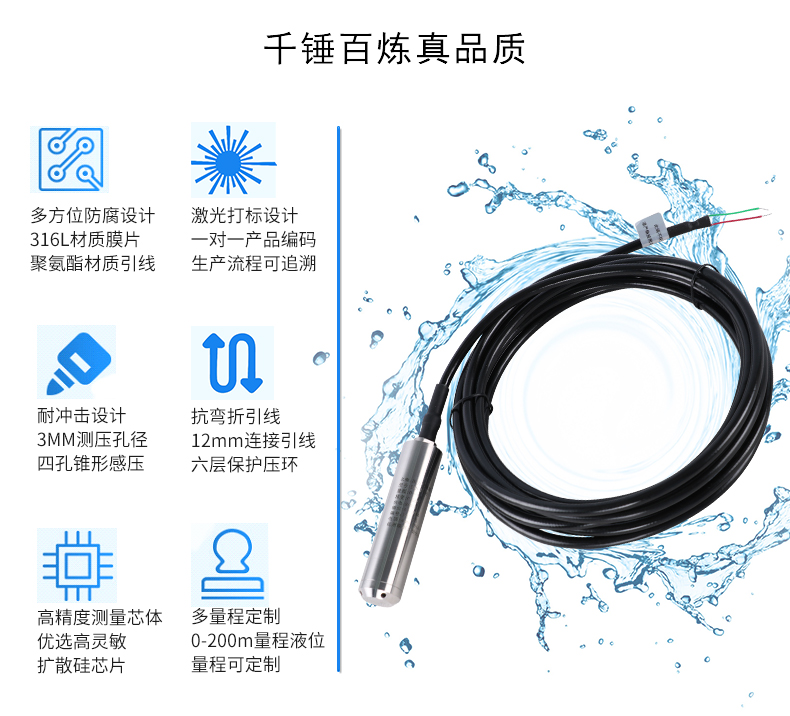 SIN-P261投入式液位變送器由高性能擴散硅壓阻式壓力傳感器作為測量元件,把與液位深度成正比的液體靜壓力準確測量出來,并經過信號調理電路轉換成標準(電流或電壓)信號輸出,建立起輸出信號與液體深度的線性對應關系,實現對液體深度的測量。產品精度高、體積小,直接投入液體中,即可測量出變送器末端到液面的液體高度,使用方便。適用于石油、化工、電廠、城市供水、水文勘探領域的液位測量與控制。經過長期老化及穩定性篩選,產品性能穩定可靠,能夠適用應用于環境比較惡劣的露天現場,同時能夠現場液位顯示,零點,滿程可遷移。